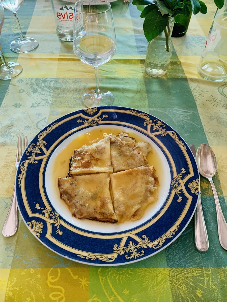 Truly a French experience in this charming 15th century farm turned into country restaurant with wooden beams, large fireplaces and copper pots everywhere. Each dish was wonderful! Foie gras with citrus sauce, veal with tarragon cream sauce and risotto, soufflé at the end! And served by our gracious host and owner Denise who has been there for over 35 years. Just 15 minutes down a country road off the highway between Chartres and Paris.